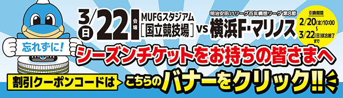 3月22日(日)「THE国立DAY」横浜F・マリノス戦の開催に伴い、明治安田J1百年構想リーグ・2026/27シーズン「シーズンチケット」をお持ちの皆様へ、シーズンチケットの取得方法および入場方法についてお知らせいたします。