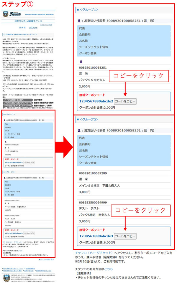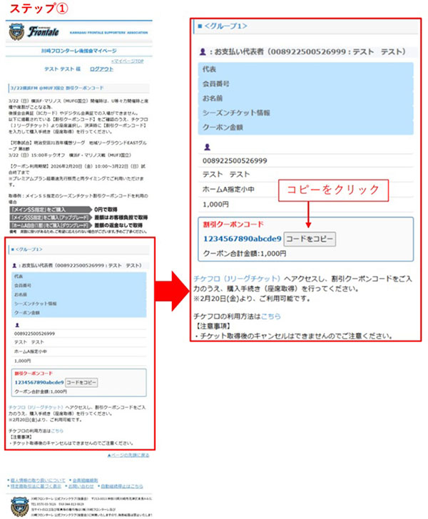 ステップ1:隣席観戦グループの申込代表者がご自身の後援会マイページへアクセスして「割引クーポンコード」を取得(コピー)する。