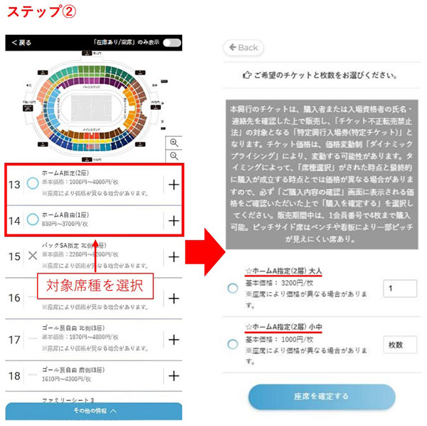 ステップ2:シーズンチケット保有者のJリーグIDでチケフロ(Jリーグチケット)にログインし、先行入場権が付く☆印付きの席種から座席を選択。