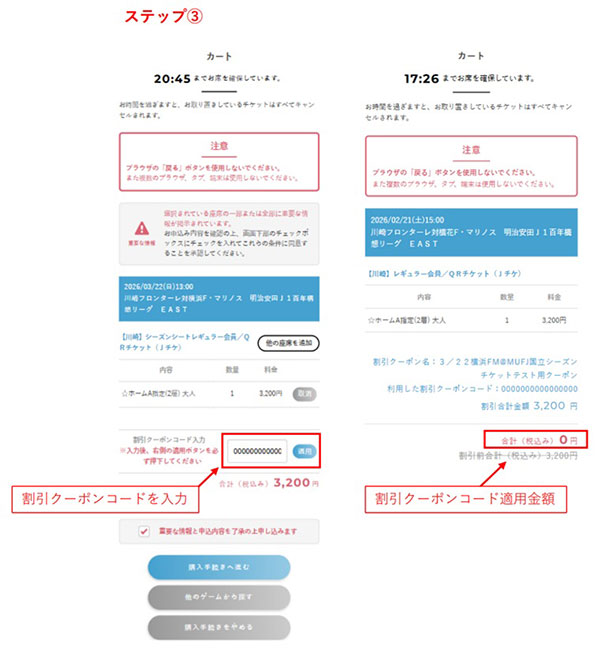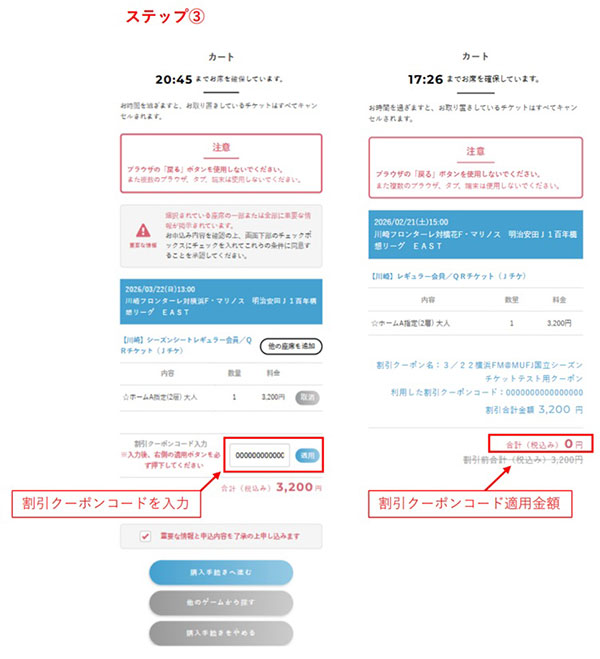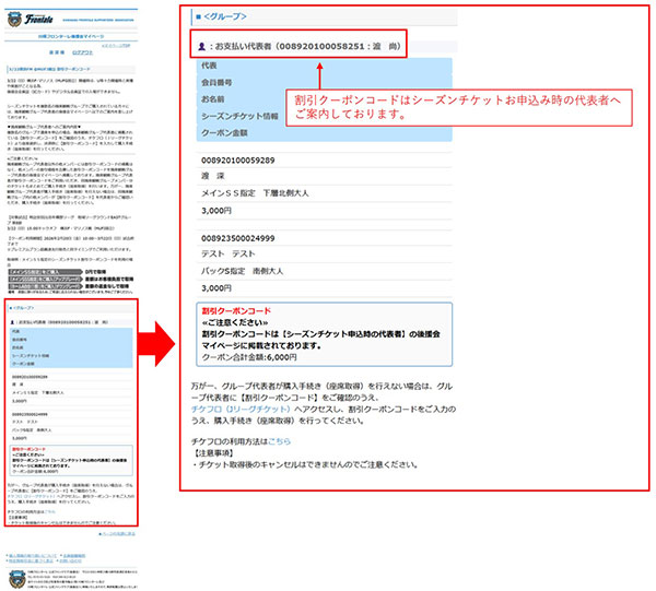 ※割引クーポンコードは隣席観戦グループの申込代表者にまとめてご案内いたします。 ・ご注意くださいグループ代表者以外の他メンバーには割引クーポンコードの掲載はなく、他メンバーの割引価格を合算した割引クーポンコードをグループ代表者の後援会マイページへ掲載いたします。グループ代表者が割引クーポンコードをご利用いただき、同グループメンバー分のチケットもまとめてご購入手続き(座席取得)を行います。 |
