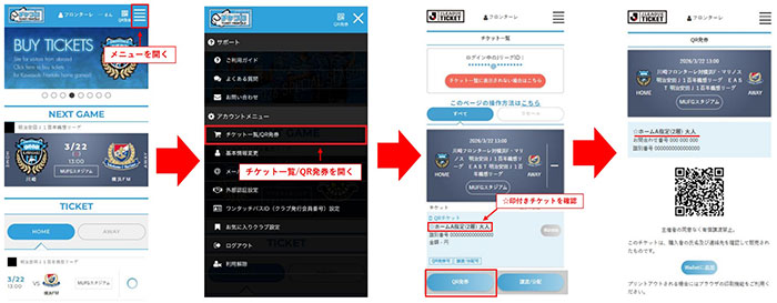 割引クーポンコードを使用して取得された先行入場権付き(☆印付き)のチケットは、チケフロ(Jリーグチケット)の「チケット一覧/QR発券」からQRコードを表示して入場ください。