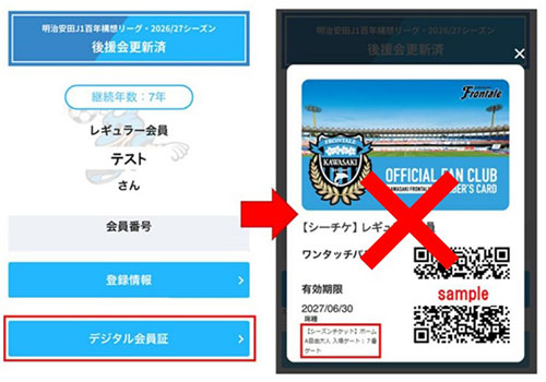 3月22日(日)「THE国立DAY」横浜F・マリノス戦は、U等々力開催時と席種・席割が異なるため、後援会会員証(ICカード)やデジタル会員証での入場ができません。
