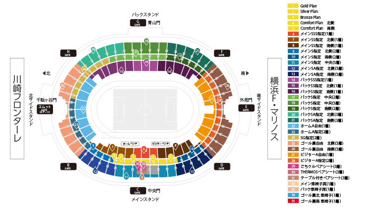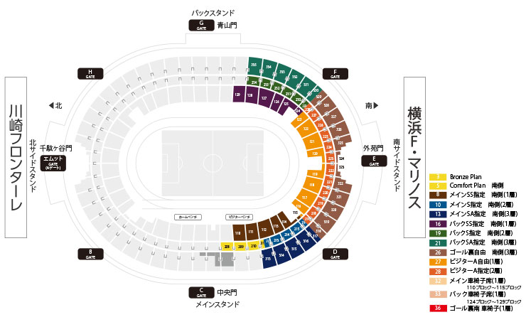 ※「メイン車椅子席(1層)(110ブロック~115ブロック)」「バック車椅子席(1層)(124ブロック~129ブロック)」「ゴール裏南車椅子(1層)」でのみ、ビジターグッズを身につけての観戦・ビジタークラブを応援する行為が可能となります。
