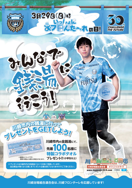 今年は3月29日(日)が「お風呂の日」=「おフロんた~れの日」です。当日は、川崎浴場組合連合会と川崎フロンターレのコラボタオルをプレゼントいたします。