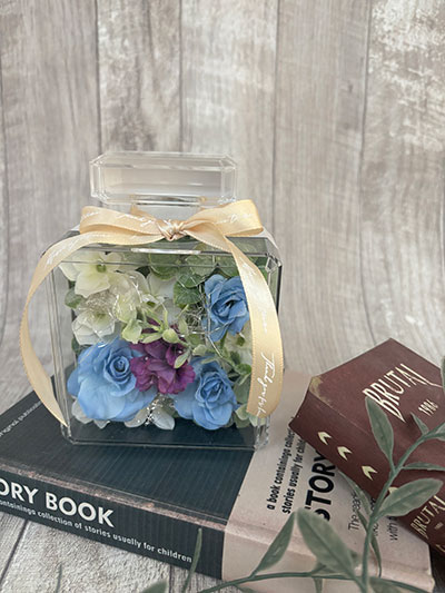 | 内容 | 香水瓶の形のクリアケースにお花を入れたおしゃれなアレンジ。 アーティフィシャルフラワーという高品質な造花を使っているため、枯れることなく、どこにでも飾っていただけます。 手のひらに乗るサイズで、とても軽いのも魅力的です。 |