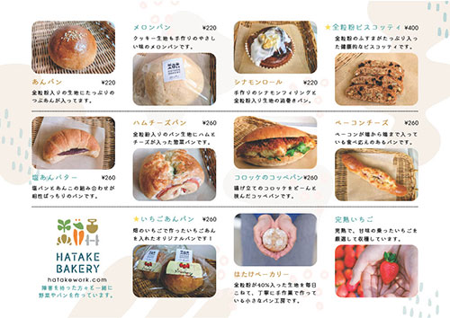 | 協力 | はたけベーカリー はたけベーカリーはさまざまな障害や難病を抱える方たちと運営するパン屋です。また、神奈川県大和市では大型ハウスでイチゴを栽培し、12~4月はベーカリーにて採れたてイチゴを販売しています。 お問い合わせ:044-948-8785 / info@hatakework.com |
