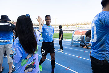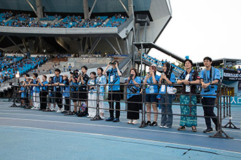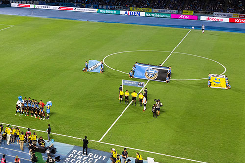 川崎フロンターレが勝利時、試合直後にピッチ横トラック上にて、選手とハイタッチをし、ともに万歳三唱をします。