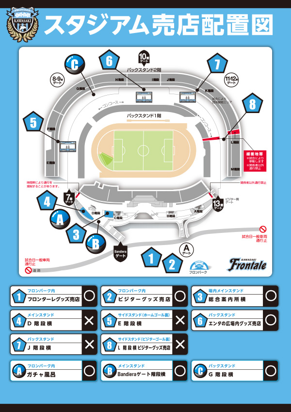 TEL 044-767-6111(営業時間 11:30~21:00/月曜定休 ※月曜日が祝日の場合は翌火曜日がお休みとなります。またホームゲーム等開催日は変更の可能性あり)