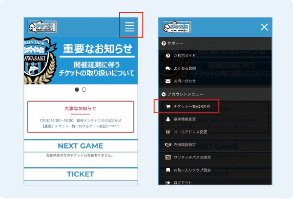 「チケフロ(Jリーグチケット)」 の右上からメニューを開き、 「チケット一覧/QR発券」を選択