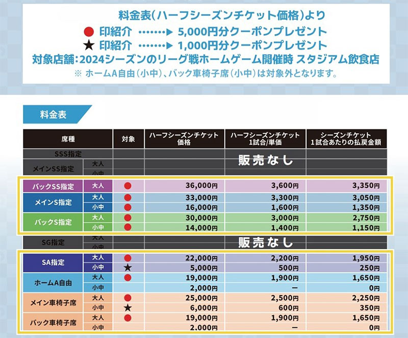 | 席種 | 区分 | ハーフシーズンチケット 価格(10試合) |