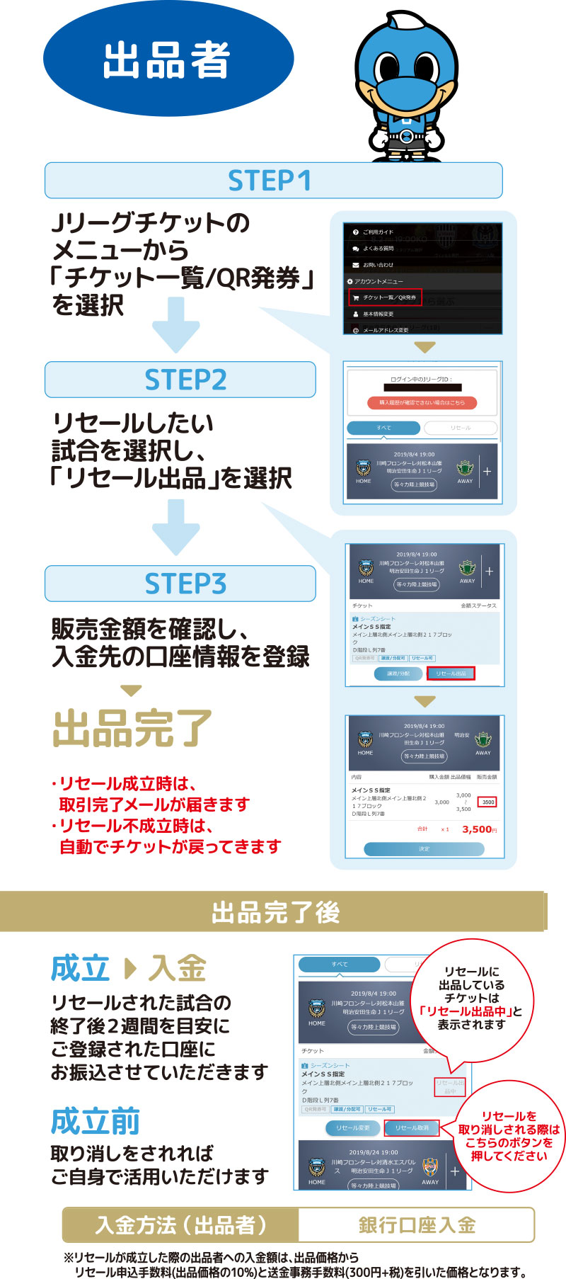 リセールが成立した際の出品者への入金額は、出品価格からリセール申込手数料(出品価格の10%)と送金事務手数料(300円+税)を引いた価格となります。